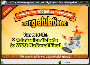 I won 2 tickets to the WCG USA Final 😐 This prize stinks! I want the graphic card or mp3 player :[